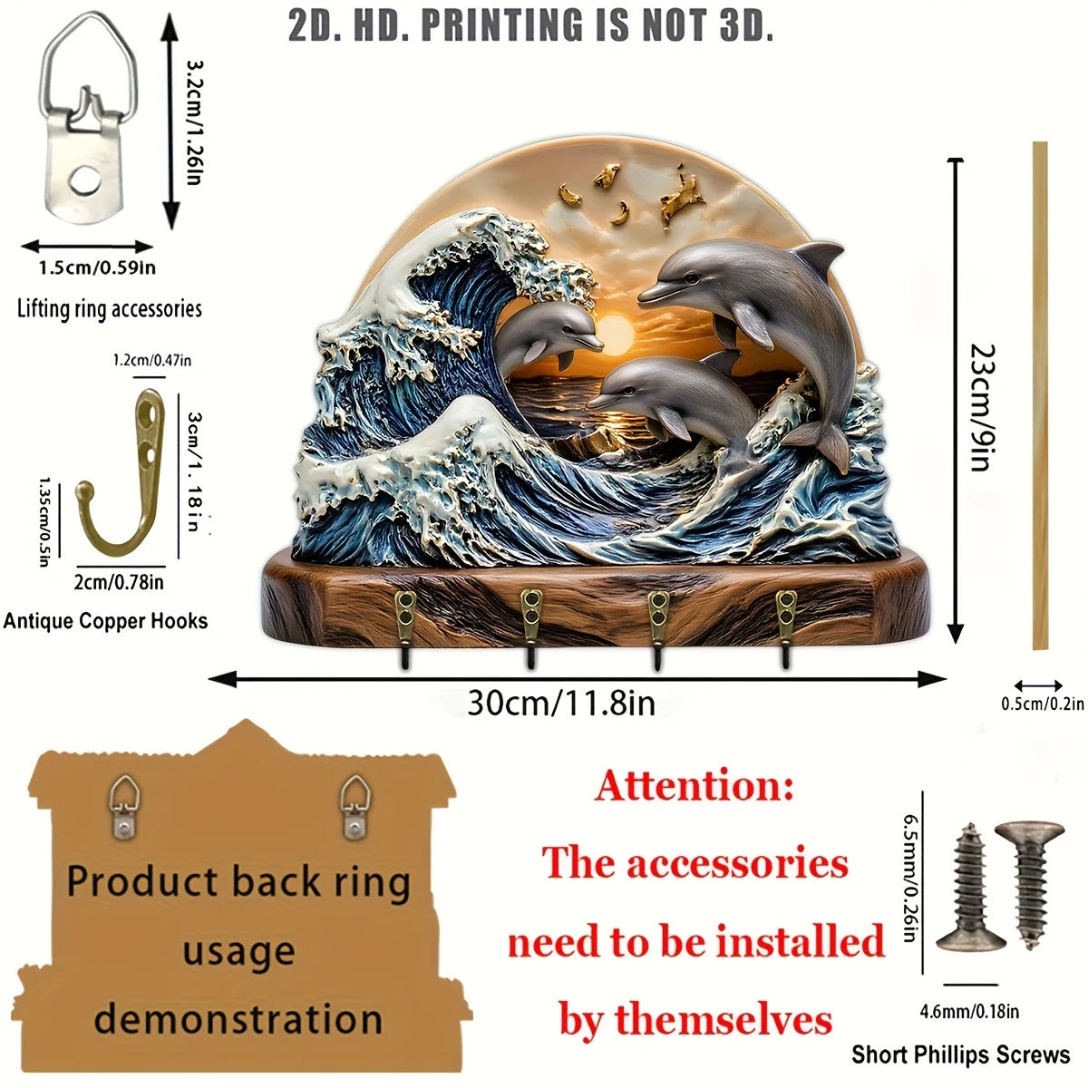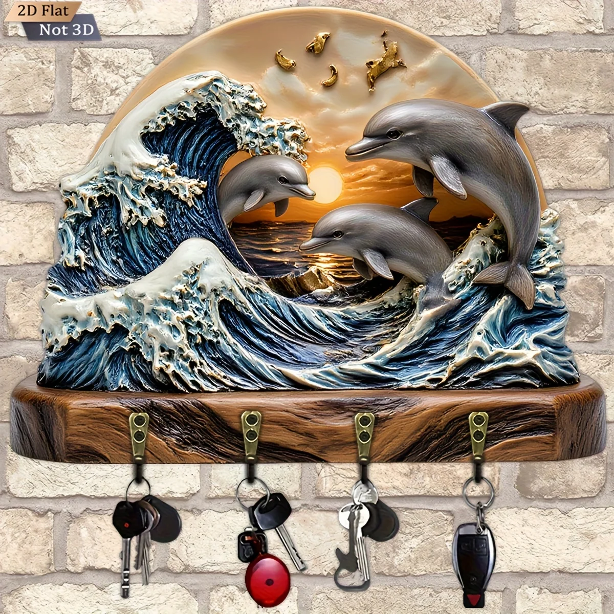 2D Flat, 1pc, Dolphin Wave Sunset Theme Key Hook Wooden Multifunctional Home Key Holder with Four Metal Hooks, Wall Decoration,