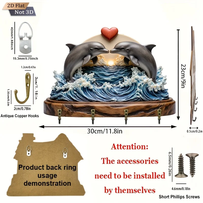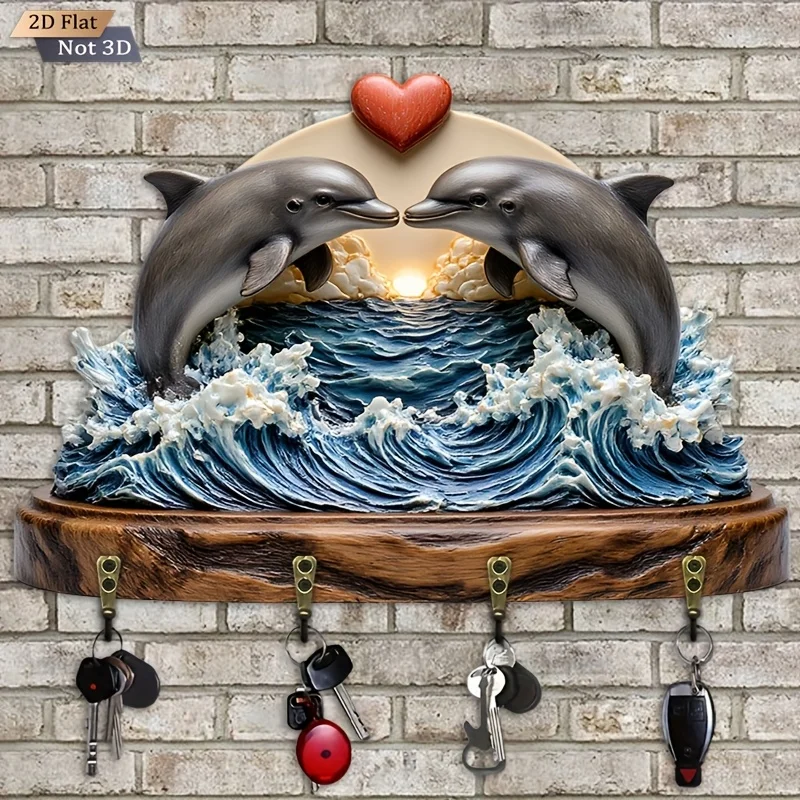 2D Flat. 1pc. Double Dolphin Heart Wave Key Hook - Wooden Multi-Functional Decorative Key Holder with Four Metal Hooks, Wall